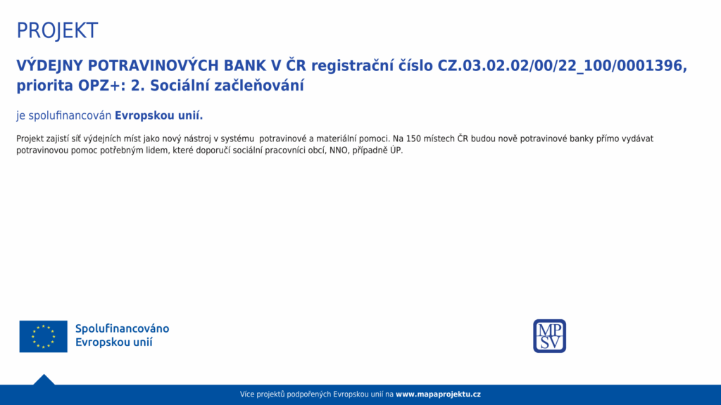 Obsah balíčků, počet podpořených osob a výběr výdejního místa bude v průběhu projektu reagovat na situaci v regionu a také kapacity regionální potravinové banky. Pro osoby ze všech cílových skupin výdejny přináší především rychlé, efektivní, maximálně transparentní a bezpečné poskytnutí potravinové pomoci, a to bez nutnosti využívání sociálních služeb.